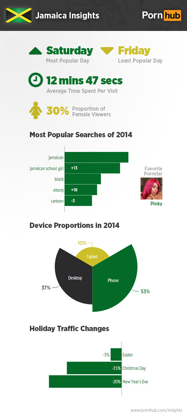 First up we’ve got Jamaica, where they chill on Pornhub for a luxurious 12 minutes and 47 seconds on average. That’s almost a whole 4 minutes more than the rest of the world! They’re also not particularly affected by the holiday season, in terms of letting Christmas or New Year’s Eve interfere with their Pornhub time, showing only 15% and 20% traffic drops on these days.