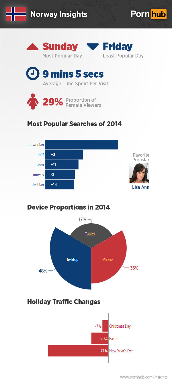 Over to Norway now where their device proportions are something to keep an eye on. With only 35% of their traffic shares allocated to mobile compared to the worldwide 45% they do fall a little short, but they make up for it in tablet use which stands strong at 17%. On Christmas Day they’re opening up presents then Pornhub on their browsers seemingly right after as traffic is only down 7% on baby Jesus’ b-day but dips down a staggering 71% on New Years Eve. Party on!