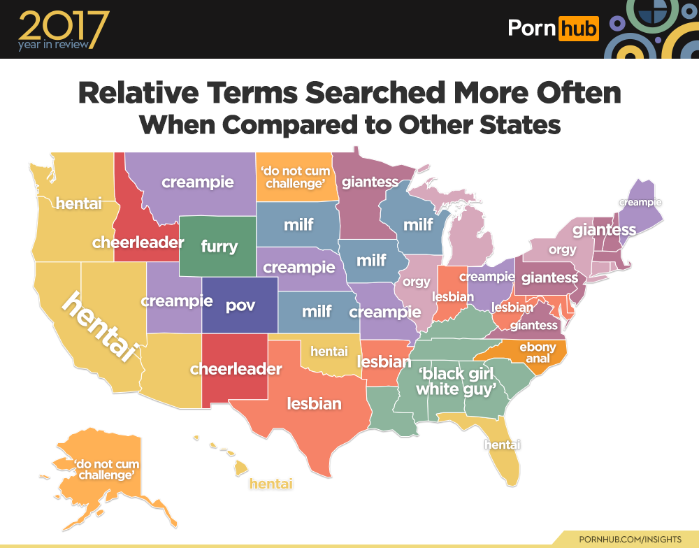 The hairiest state in the union happens to be Wyoming, where ‘furry’ (which is exactly as it sounds, but worth a google search) is searched more often than anywhere else in the country. Visitors from Colorado are more likely to search ‘pov’ (point of view) videos. Searches for ‘giantess’ were big up-north, along with ‘orgy’. In 2017, a large number of Southern states showed their lover for interracial porn with ‘black girl white guy’ being searched there far more often than elsewhere in the Untied States.