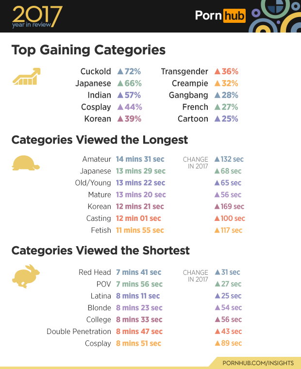Topping off the gaining categories for 2017, is ‘Cuckold’ (nsfw) where views have increased by 72%. Popularity for the Transgender (nsfw) category increased by 36%, and ‘Cartoon’ (nsfw) is up by 25%. ‘Amateur’ (nsfw) caught viewers’ attention for the longest amount of time at with views on videos in the category lasting an average of 14 minutes and 31 seconds, which is 132 seconds longer than last year. Views in the ‘Fetish’ (nsfw) category are also up with a 117-second increase from last year, at 11 minutes and 55 seconds.
