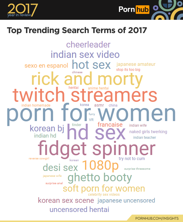 Rick and Morty porn parodies also blasted off this year, and the passing fascination with Fidget Spinners caused a big spike in porn searches (and some very creative amateur videos). Lots of people discovered ASMR (Autonomous Sensory Meridian Response) porn this year, too and liked what they heard. We also saw major increases in the popularity of Hentai (nsfw) around the world, and fans of cheerleaders caused a massive boost in these searches as well.