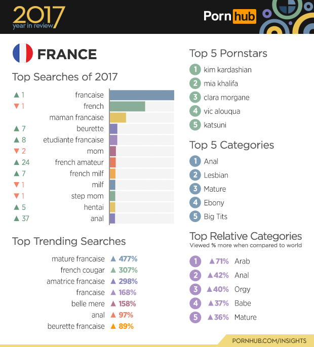 France is a bit more anal than everyone else is this year, with the category being 42% more viewed here than elsewhere in the world, in fact. The number one search category for France also happened to be, you guessed it, “Anal”. But, the top trending searches here consisted of ‘mature francaise’ up by 477% and ‘French cougar’ up by 307% and sneaking in the back door, ‘anal’ with an increase of 97%. Born in France, Clara Morgane (nsfw) and Vic Alouqua (nsfw) are the 3rd and 4th most searched pornstars in their home country.