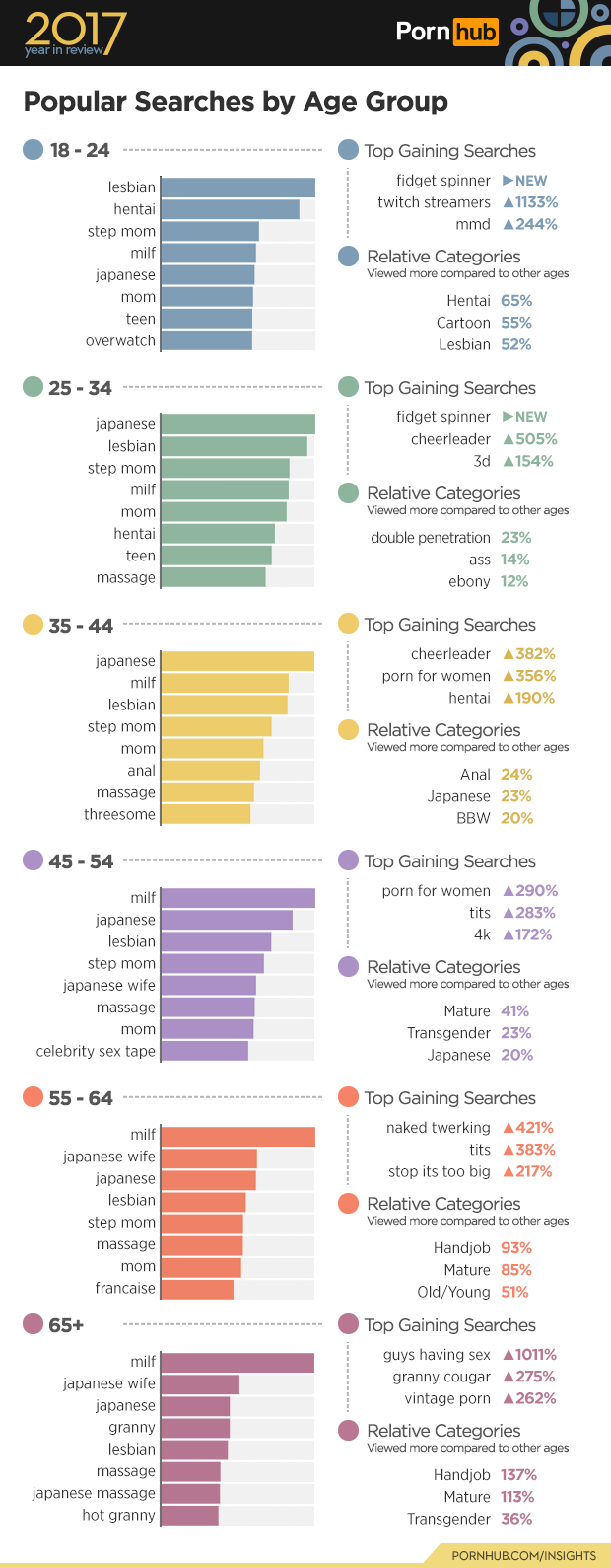 Women are not the only sex seeking out a cheer squad, as ‘Cheerleader’ increased in searches by 357% for men as well. ’Fidget Spinner’ made its debut on the most searched terms for 2017, and since they were unheard of in 2016, we have no numbers to compare the increase to just yet! It would seem that men were more interested in speaking the language of love this year with ‘francaise’ increasing by 223% from last year’s searches. It appears that many men are still playing games with ‘minecraft’ making a 156% increase over last year’s searches. The terms ‘MILF’ and ‘step mom’ remain the top searches for men in 2017. ‘Japanese’ has taken a step forward, grabbing third place from last year’s ‘step sister’. Hentai’s searches increased by 89% compared to last year, and landed ‘hentai’ as the fourth most searched term for men. ‘Massage’, ‘Ebony’ and ‘Asian’ rounded out men’s favorites just as they were last year, but ‘anal’ managed to work its way up four searches from the bottom, surpassing ‘overwatch’ and ‘VR’.