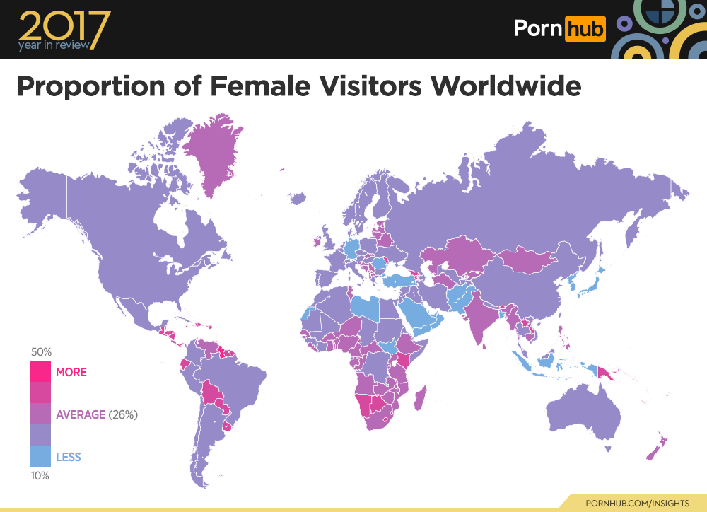 The map below colorfully illustrates the proportion of female visitors worldwide! When compared to last year, 2017’s map tells us that female visitors in China are a bit less excited about porn, while things are heating up a little more in southern hemisphere as indicated by the higher concentrations of pink visible there.