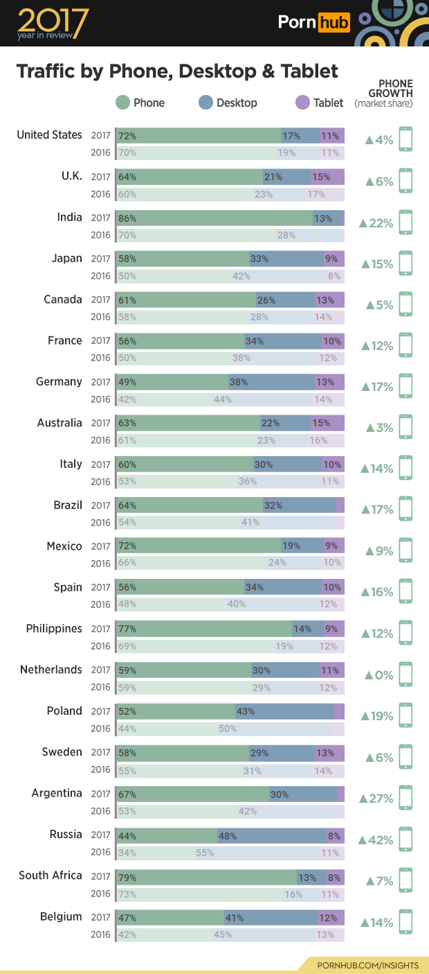 Throughout 2017 smartphones continued to rise a further 5% in market share, now representing 67% of all traffic, joined by tablets making up a further 9%. Desktop (and laptop) computers now make up less than a quarter of all Pornhub traffic. Some countries had substantial increases in smartphone use, such as South Korea with 74% growth in market share and an increase of 79% in Cuba.