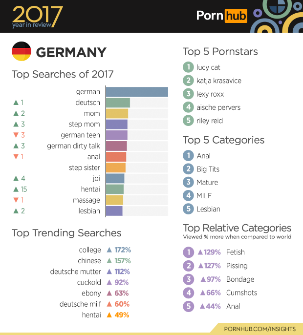 In Germany, Riley Reid only ranks 5th, meaning the top 4 pornstars appear to be a fresh roster of German talent including Lucy Cat (nsfw) and Lexy Roxx (nsfw). This doesn’t seem odd because they always seem to be doing their own thing, it’s whatever gets you going… and for Germany that might be Germans which is why ‘deutsch’ jumped up one spot on the top searches list. The country is however, entering some new territory with the ‘Fetish’ category being viewed here 129% more than elsewhere in the world – same with the ‘pissing’ category at 127% (this may not be a coincidence). ‘Hentai’ made the largest leap up 15 spots from last year, making a significant move towards the country’s top searches.