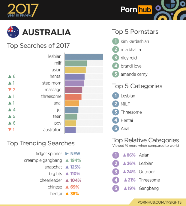 Australia proves their love for their vast interior desert wilderness, also known as the Outback, with the Outdoor category being 24% more popular there than in other countries. With such beautiful surroundings, the increase of ‘snapchat’ searches by 125% from last year shouldn’t come as a surprise. ‘Threesome’ is up by one and ‘massage’ has seemingly lost its touch, making a drop of 2 spots on the top searches chart.