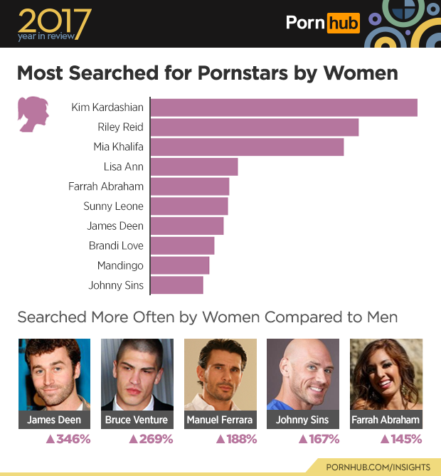 Once again, Kim Kardashian remains the most searched Pornstar by women, and Mia Khalifa is now in third place after being surpassed by Riley Reid who is sitting quite comfortably at second place for the year. There are some new additions to the list since last year, including Brandi Love (nsfw) (whom is also the co-owner and chief financial officer of two multimedia companies) and Johnny Sins (nsfw) (said to be one of the most popular performers in porn for the Millennium-class). Johnny was searched for 167% more by women, as well as Bruce Venture (nsfw) who was searched for 269% more by female viewers to the site than by men.