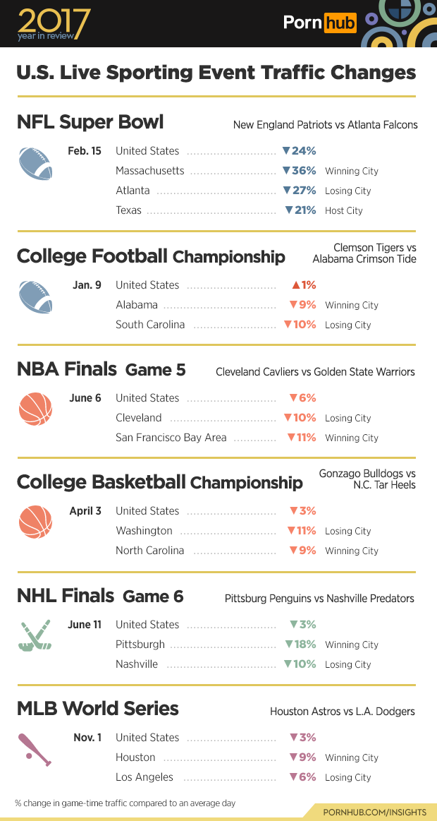 Many of Pornhub’s biggest traffic drops happen during live sporting events. Football fans seem to be the most dedicated to their sport, with traffic across the United States dropping by 24% during the Super Bowl. The largest drops typically happen in cities that are home to the playing teams. For example, traffic in Boston dropped by 36% during game-time, as fans watched the Patriots run to victory over the Falcons. To see how game-time traffic changes by hour, you can check out our complete Super Bowl 51 Insights. We also recorded major traffic changes during the NBA Finals , NHL and MBL World Series throughout 2017.