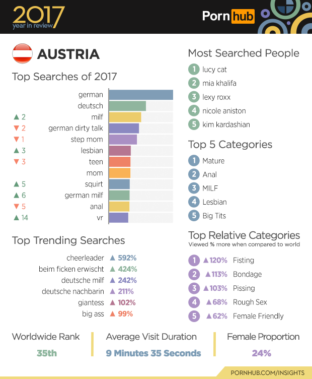 Once again, searches for “german” and “deutsch” remained the most popular terms in Austria in 2017. Austria’s average visit time closely matched their German neighbors at around nine and a half minutes, and they shared “lucy cat” at the most searched person. Austrians are 120% more likely to view the “Fisting” category when compared to the rest of the world, and 113% more into “Bondage” videos.