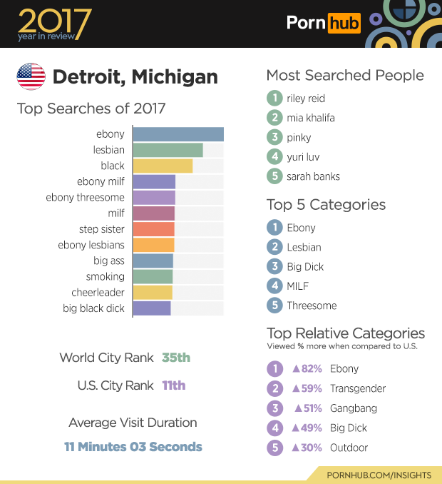Detroit ranks 11th for U.S. cities bringing traffic to Pornhub, and 35th among all cities worldwide. “Ebony” tops the list of searches in the city of Detroit, followed by “lesbian” and “black”. Visitors from Detroit hold out about 30 seconds longer than the U.S. average visit duration of 10 minutes 33 seconds. The “ebony” category is 82% more popular in Detroit compared to elsewhere in the U.S., followed by a 59% increase in the popularity of “transgender” videos. Check out our 2017 State of the Union to see how each state fared in 2017.