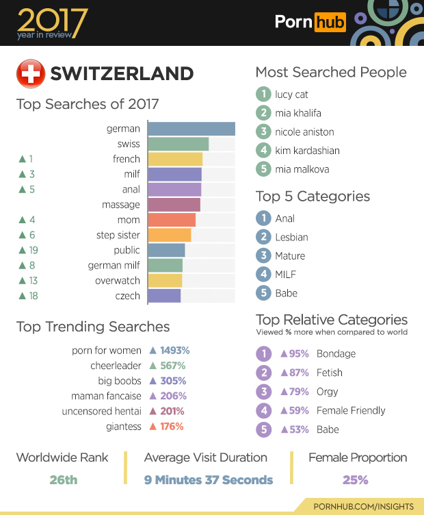 Visitors from Switzerland spend an average of 9 minutes 37 seconds on Pornhub, just about matching their German and Italian neighbors, but falling short of France. The number one search in Switzerland is “german”, followed by “swiss” and then “france”. Searches for “czech” also climbed an impressive 18 spots in 2017. When compared to the rest of the world, Switzerland’s visitors are 95% more likely to view the Bondage category, and 87% more interested in Fetish. Searches for “porn for women” followed the worldwide trend in 2017 and gained an impressive 1493% in popularity.