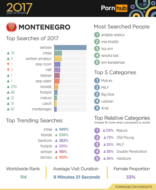 Montenegro’s number one search in 2017 was “serbian” followed by “srbija”, which increased by 949% in popularity over the last year. Serbian porn actress Anđela Mitkovski is the most searched person in Montenegro. Visitors are 113% more likely to view the Mature category compared to the rest of the world, and 73% more into Old/Young videos.