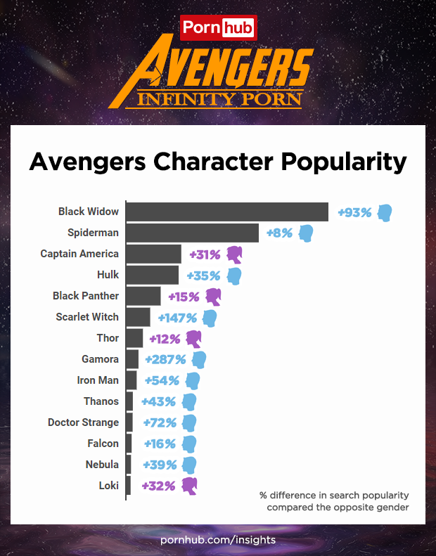 Historically, DC characters like Harley Quin, Wonder Woman and Batman are searched more often on Pornhub than Marvel characters, but “Avengers” and it’s characters were searched over 6 million times in 2017.