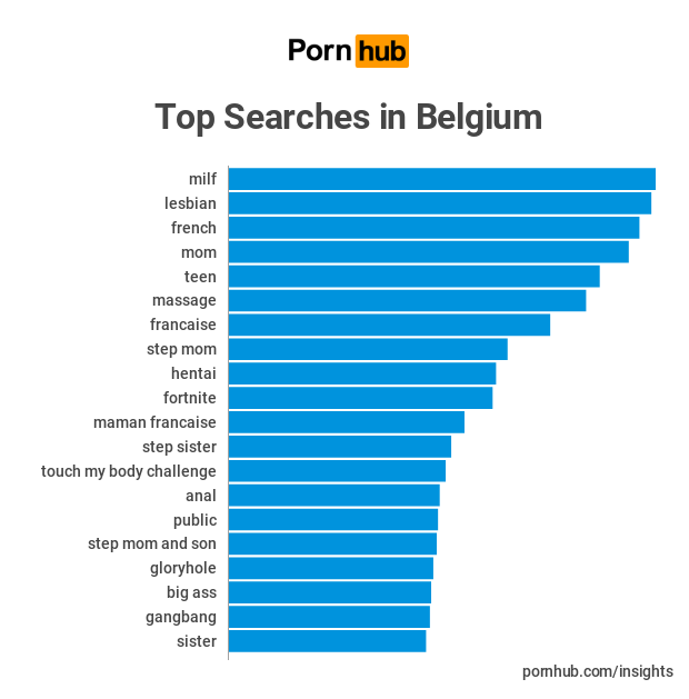 The most popular search term in Belgium is “MILF”, followed by “Lesbian” and “French”. In our 2017 Year in Review we found that Belgium’s top two terms were “francaise” and “french”, indicating that they have fallen a few positions in favor of other go-to genres.