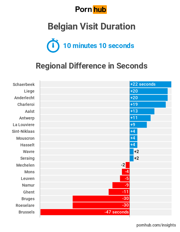 The average visitor from Belgium spends 10 minutes and 10 seconds each time they visit Pornhub. Some cities take a bit more time, such as those visiting from Schaerbeek, Liege and Anderlecht who all need an extra 20 seconds. Visitors from Brussels come and go a full 47 seconds faster than the Belgian national average.