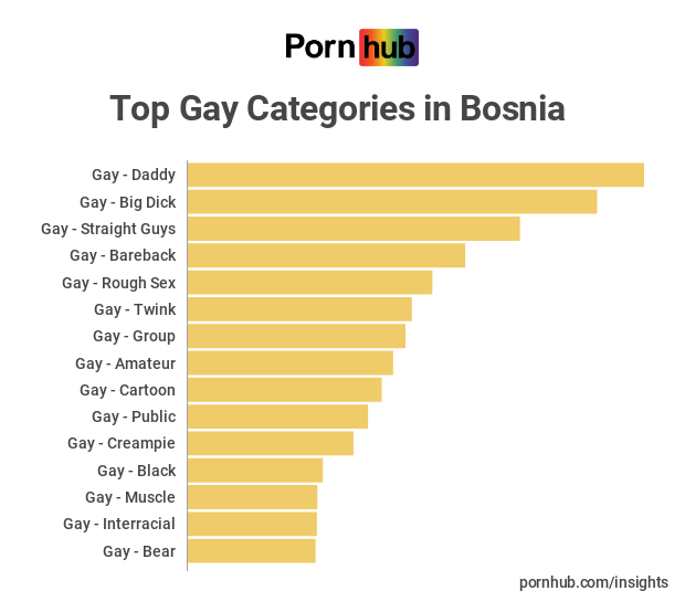 Visitors to Pornhub Gay pages from Bosnia are most likely to view the “Gay – Daddy” category, followed by “Gay – Big Dick” and “Gay – Straight Guys”.