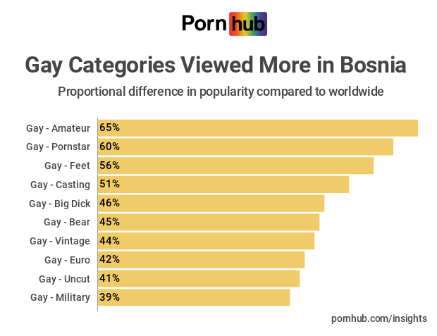 When compared to gay content viewers worldwide, Bosnians are 65% more likely to view “Gay – Amateur”, 60% more into “Gay – Pornstar” and 56% more into “Gay – Feet”.