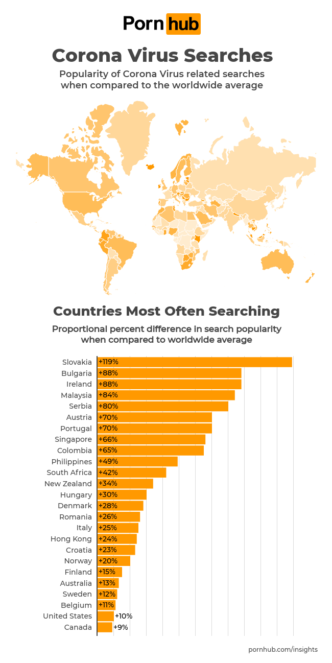 When compared to the rest of the world, visitors from Slovakia are 119% more likely to search for Coronavirus on Pornhub. Searches are more than 80% more popular in Bulgaria, Ireland, Malaysia and Serbia.