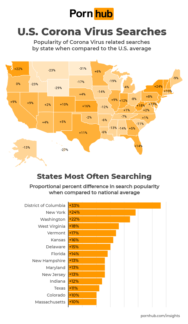 In the United States, it’s visitors from Washington, D.C. who are the most likely to search for Coronavirus on Pornhub. In fact, D.C. visitors are proportionately 33% more likely to search. Visitors from New York are 24% more likely to search, 22% in Washington state and 18% more in West Virgina. Folks from North Dakota are the least likely to search by -43% when compared to the rest of the country.