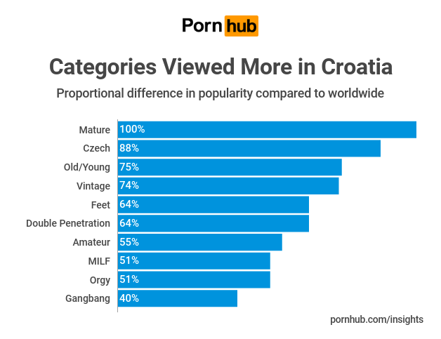 Our statisticians found that “Mature” is proportionately 100% more popular in Croatia when compared to the rest of the world, “Czech” videos are 88% more popular, and the “Old/Young” Category is 75% more popular.