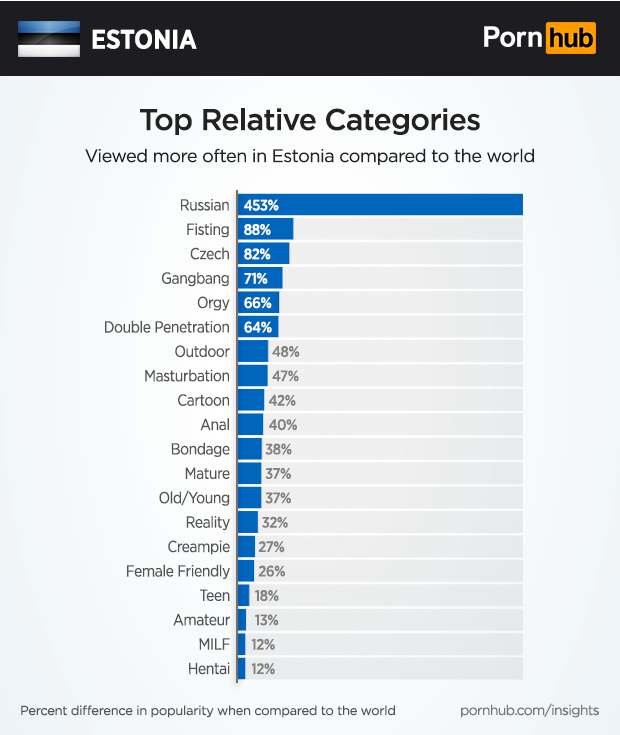 When compared to the rest of the world, Estonians are proportionately 453% more likely to view the “Russian” category, 88% more likely to view “Fisting” and 82% more for “Czech” videos.