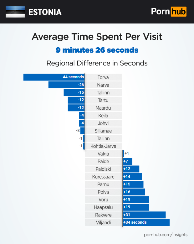 While the average Estonian spends 9 minutes and 26 seconds on Pornhub, visitors from some cities spend significantly more or less time on the site. In Torva, visitors come and go 44 seconds faster, but in Viljandi they take 34 seconds longer.