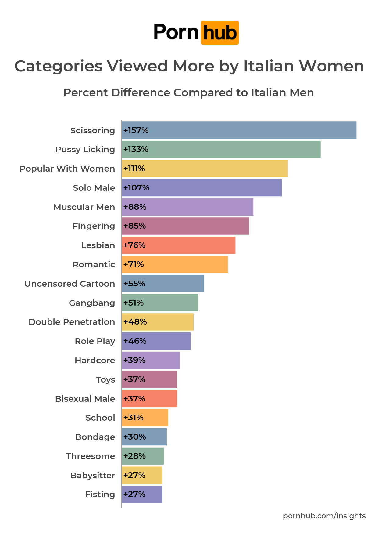 Taking a look inside the country, here’s the list of categories that are more likely to be seen by Italian Women when compared to Italian Men, in the eternal struggle between the sexes.