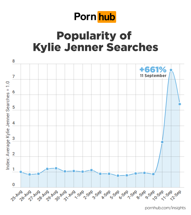 When Kylie Jenner’s Playboy cover photo was revealed, Page Six reached out to see if it had an effect on Pornhub’s searches. Our statisticians found that searches for her name shot up +661% on September 11th, 2019. What’s more impressive is that represents a larger single-day increase in popularity than her big sister Kim’s +629% when she appeared on the cover of Paper Magazine in 2014.