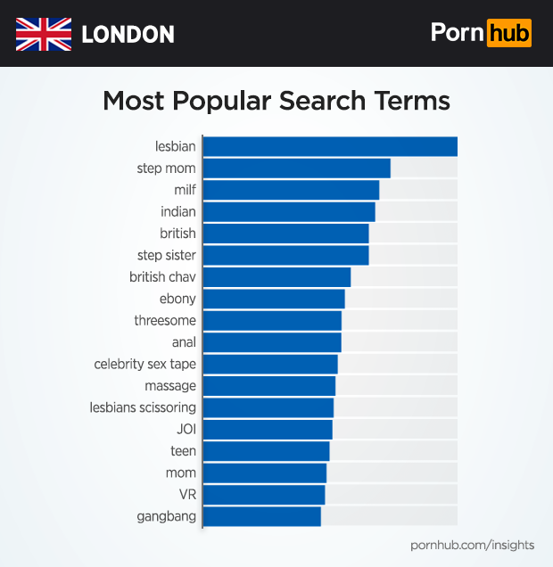 Because London accounts for over 20% of Pornhub’s U.K. visitors, the most popular search terms are quite similar to the country in general. “Lesbian” is the most popular search, followed by “step mom” and “MILF”. Interestingly, searches for “Indian” rank higher than “British”, and we once again see a large number of searches for “british chav” which we had previous taken a more in-depth look at.