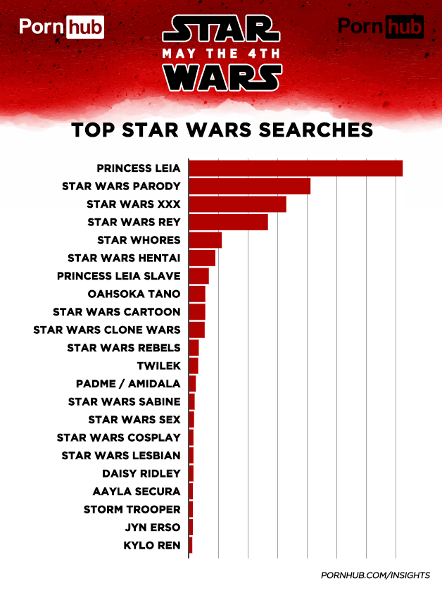 Whether they favor the light side or the dark side, the force is strong with Pornhub users. Trusted Reviews asked the Insights team whether “Star Wars Day” affects viewership and searches. While our statisticians can’t see what side of the force our visitors favor, they do have a plethora of Star Wars related data on hand — in particular when May the 4th comes around. On that most geeky of all holidays, Star Wars related searches grow by an empire sized 10430% as visitors enjoy some Hand Solo action.