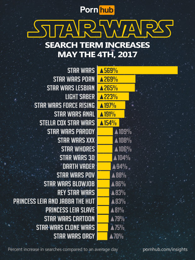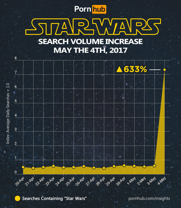 The force remains strong with Pornhub users. So much so, that ‘Star Wars’ searches increased an incredible 633% this May the 4th, handily beating last year’s increase of 510%. Star Wars is consistently one of the most searched for porn parodies among our 75 million daily visitors, so this number represents an empire worthy increase.