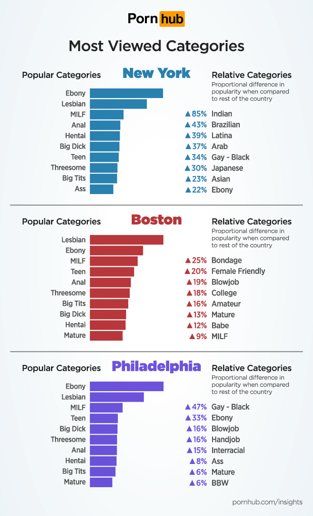 In Boston, Bondage is 25% more popular, as well as 20% for Female Friendly and 19% for Blowjob. In Philadelphia, the Gay – Black category is 47% more popular than elsewhere in the U.S., as well as a 33% increase for Ebony videos.