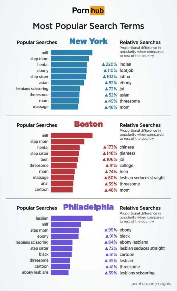 The most popular search terms in New York and Boston are ‘MILF’, ‘step mom’ and ‘hentai’. Philadelphia beats to a different drum, with ‘lesbian’ ranking first, following by ‘MILF’ and ‘step mom’. We find it interesting that while lesbian consistently ranks as one of the top search terms in the United States, it doesn’t make the Top 10 list in either New York or Boston, although ‘lesbian scissoring’ searches are popular in N.Y.C.