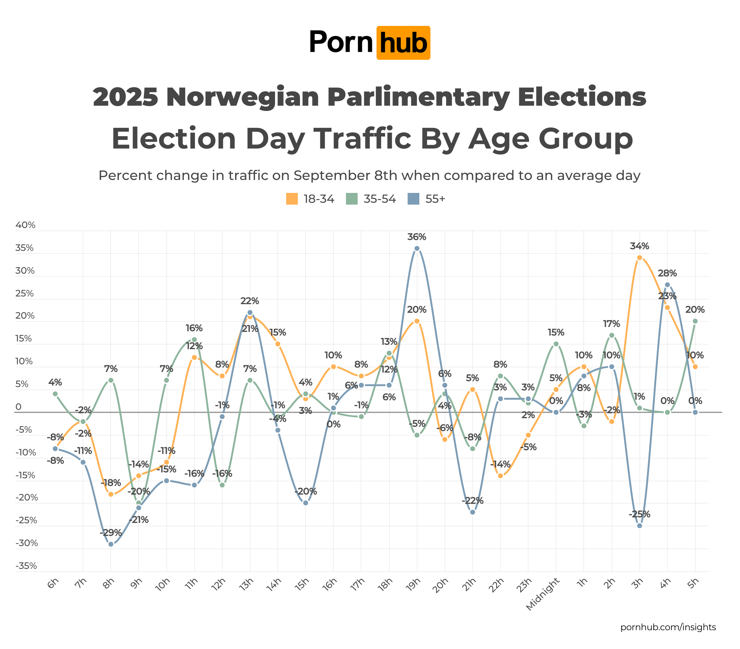 On September 8, millions of Norwegians across the country took to the polls to vote in the parliamentary election. Naturally, an event of this scale impacts traffic to Pornhub, and when our friends at Nettavisen asked our statisticians to pull the data, they were happy to oblige.