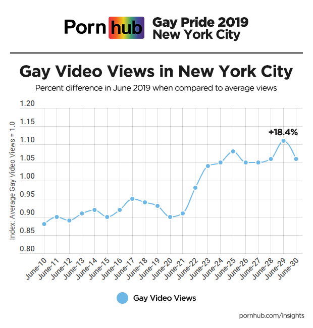 Our statisticians looked back a bit further, and found that views of gay (male) videos in New York had already increased significantly over the preceding week by an average of +15% and a peak of +18.4% on June 29th.