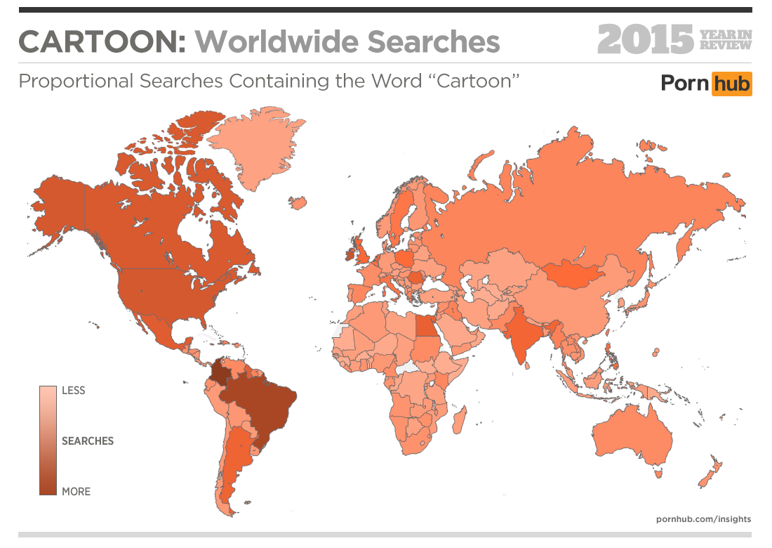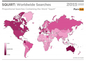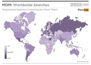 Click through this gallery to see where our top terms are searched for the most and least throughout the world. Some interesting trends pop out here. For one, searches for ‘cartoon’ and ‘lesbian’ are much more prominent in the western hemisphere, and searches for ‘black’ increase in popularity in the US and southern Africa. Searches for ‘step mom’ and ‘step sister’ are proportionally higher in English speaking countries, whereas our users in most of Asia and Africa don’t seem to be overly interested in content featuring squirting.
