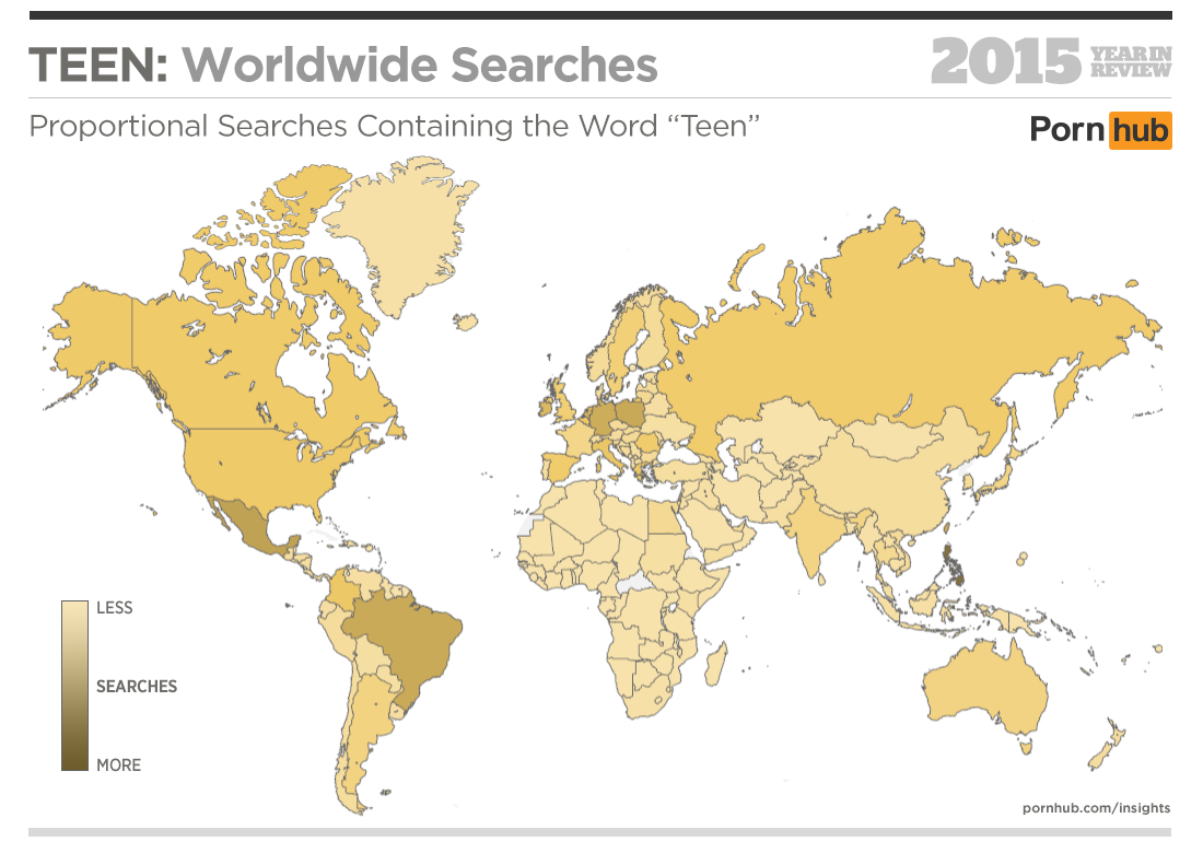 Not only was ‘Lesbian’ 2015’s top searched term on Pornhub, it also happens to be the category with the highest number of views. The ‘Teen’ category holds it down in second place, followed by the ‘Big Dick’ category which is up one spot at third place. Some new and evidently quite popular categories were added to Pornhub this year, namely ‘Babysitter’ sitting in at 12th place and ‘Cartoon’ in at number 20. The ‘Public’ category jumped an impressive 30 spots and is currently the 19th most viewed category on the site. Formerly known as the ‘Outdoor’ category, the name change is likely what brought about the sizable jump.