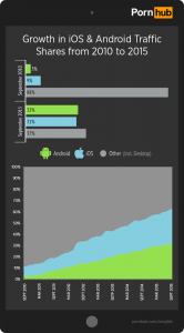 We also really enjoy reporting on how different OS users interact with the site. Back in September, we released our Apple vs. Andorid post which gave the full run down on which types of porn is preferred within these 2 major subsets of our user base. In this next section we get back to basics with updated traffic shares stats. We’ll begin with desktop. Windows is still in the lead when it comes to which operating system our computer using viewers visit Pornhub with. However the proportion of MacOs desktop traffic shares are up from 11.5% last year to 13% this year.