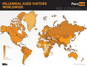 This year we also began exploring age demographics, again thanks to anonymized data from our web analytics tool. While the average Pornhub viewer is aged 35.3 years old, around 60% of our viewers are millennial-aged. These figures alter from country to country, however. For instance, in countries like the India and the Philippines which have median ages that are lower than the world average (22 and 27, compared to 29 worldwide), there are much higher proportions of younger viewers.