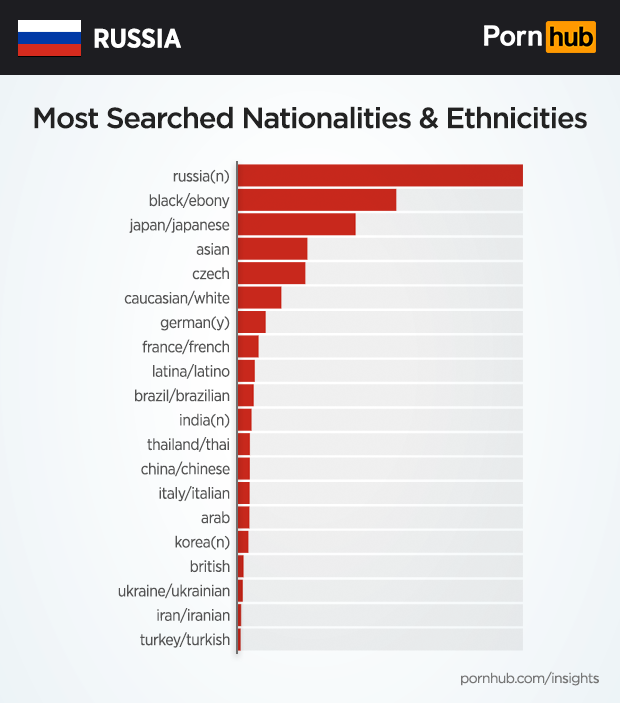 Our statisticians decided to take a closer look at what nationalities and ethnicity are most often searched in Russia. Of course fellow Russians are the most popular, followed by porn featuring black/ebony pornstars. Japanese and asian are quite popular, as well as porn featuring Czechs. Germany and France rank closely to each other, as well as porn featuring Latinos.