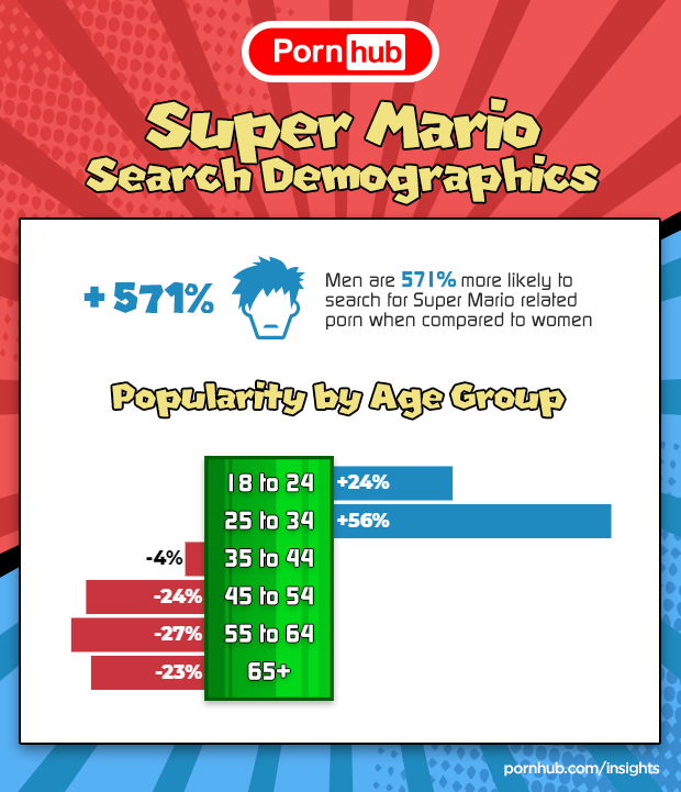 Pornhub’s statisticians sorted through months of search data to see what Super Mario related searches were most popular. The results showed that “Mario” just edged out “Princess Peach” and that “Bowsette” still remains popular nearly two years after going viral as a hypothetical fan-art creation.