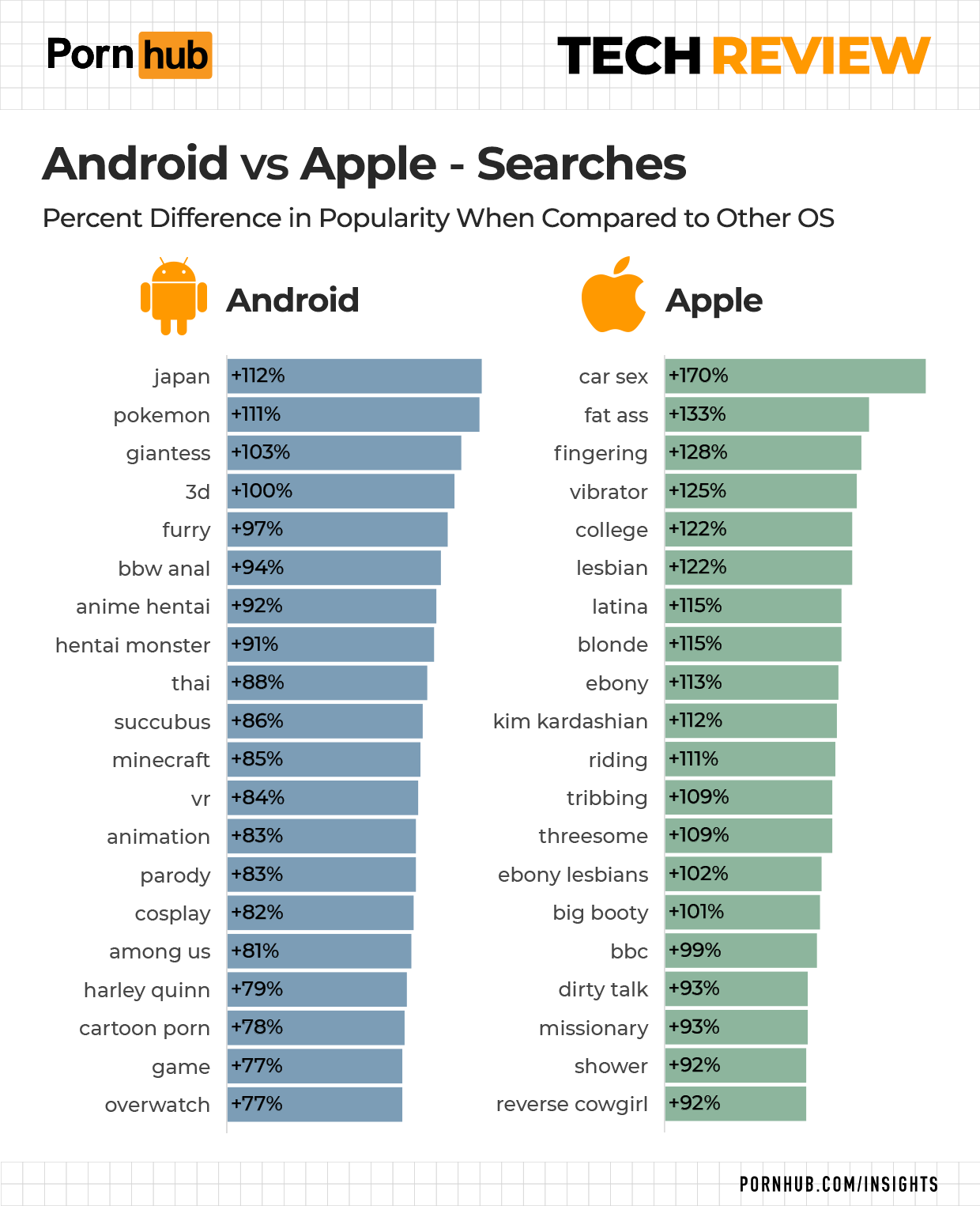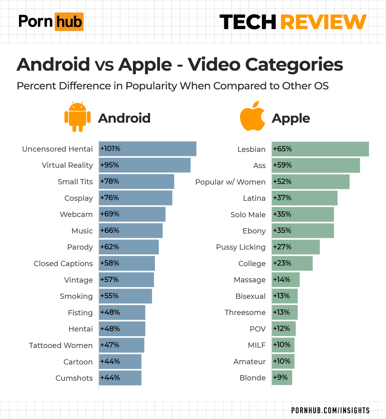 Android users are +95% more likely to watch “Vitual Reality” content, while Apple users are +59% more likely to watch “Ass” videos.