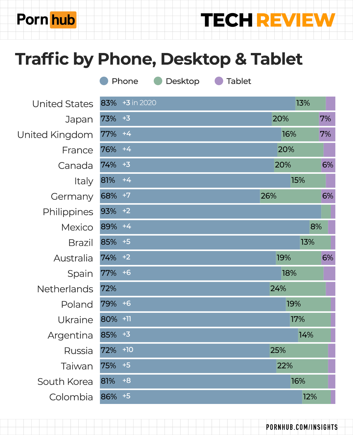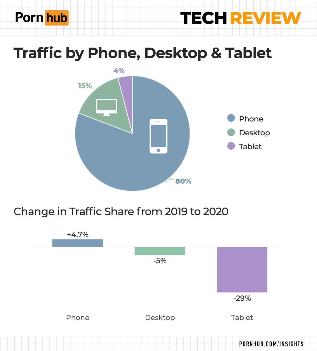 In 2020, mobile devices made up 84% of all Pornhub’s traffic worldwide. 80% of that was from smartphones, which saw their share grow by +4.7%. Tablet traffic was reduced another –29% in 2020, while desktop and laptop traffic were reduced to just 15% of Pornhub’s global traffic.