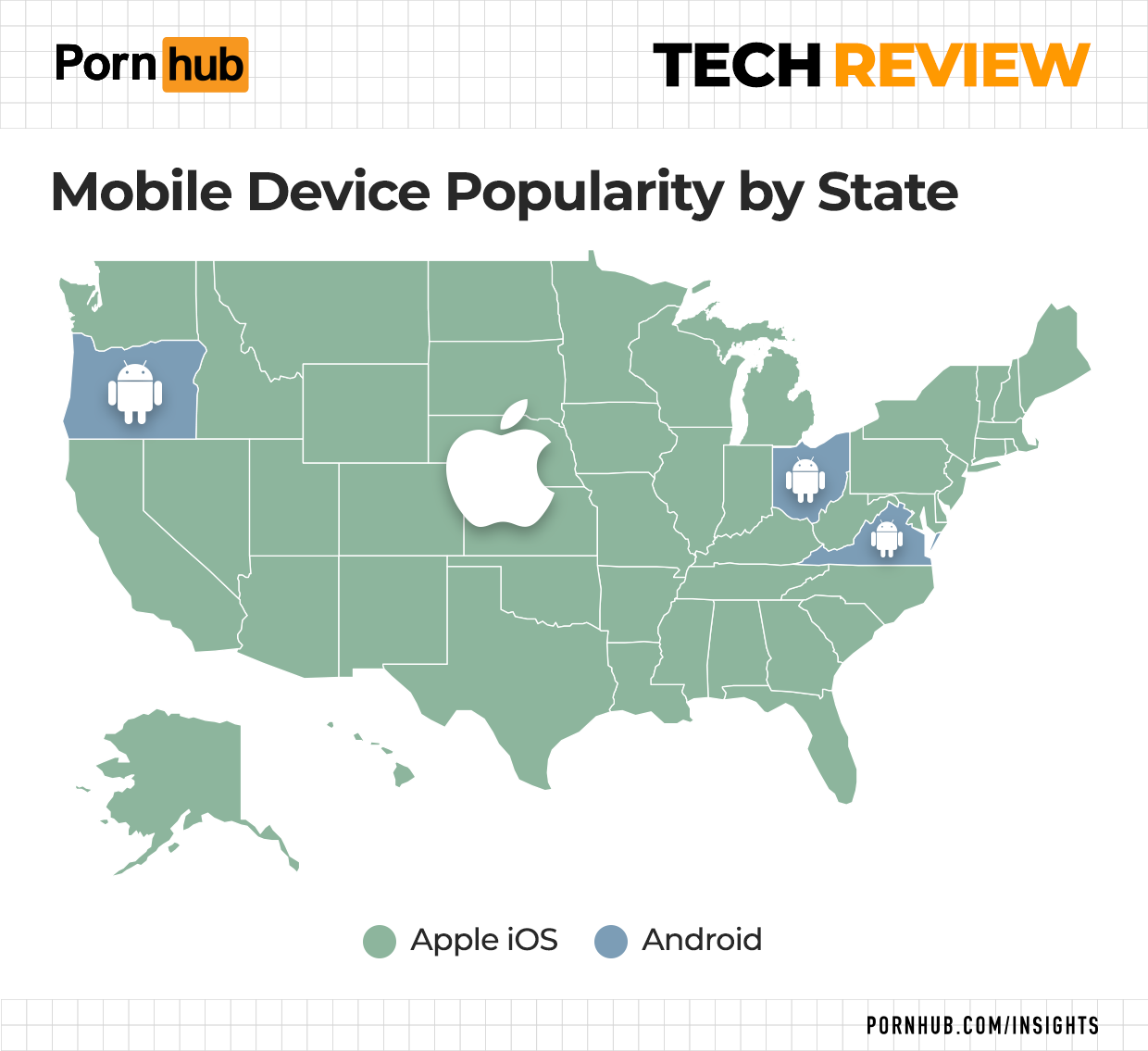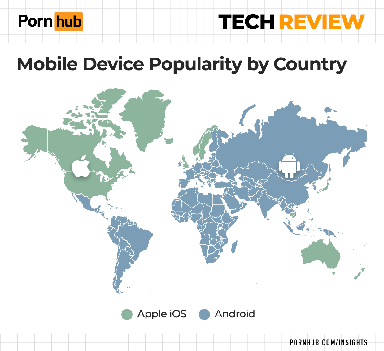 Apple’s iOS is more popular in the Western countries that most frequently visit Pornhub, while Android is used to visit Pornhub throughout much of Europe, Asia, Africa and South America.