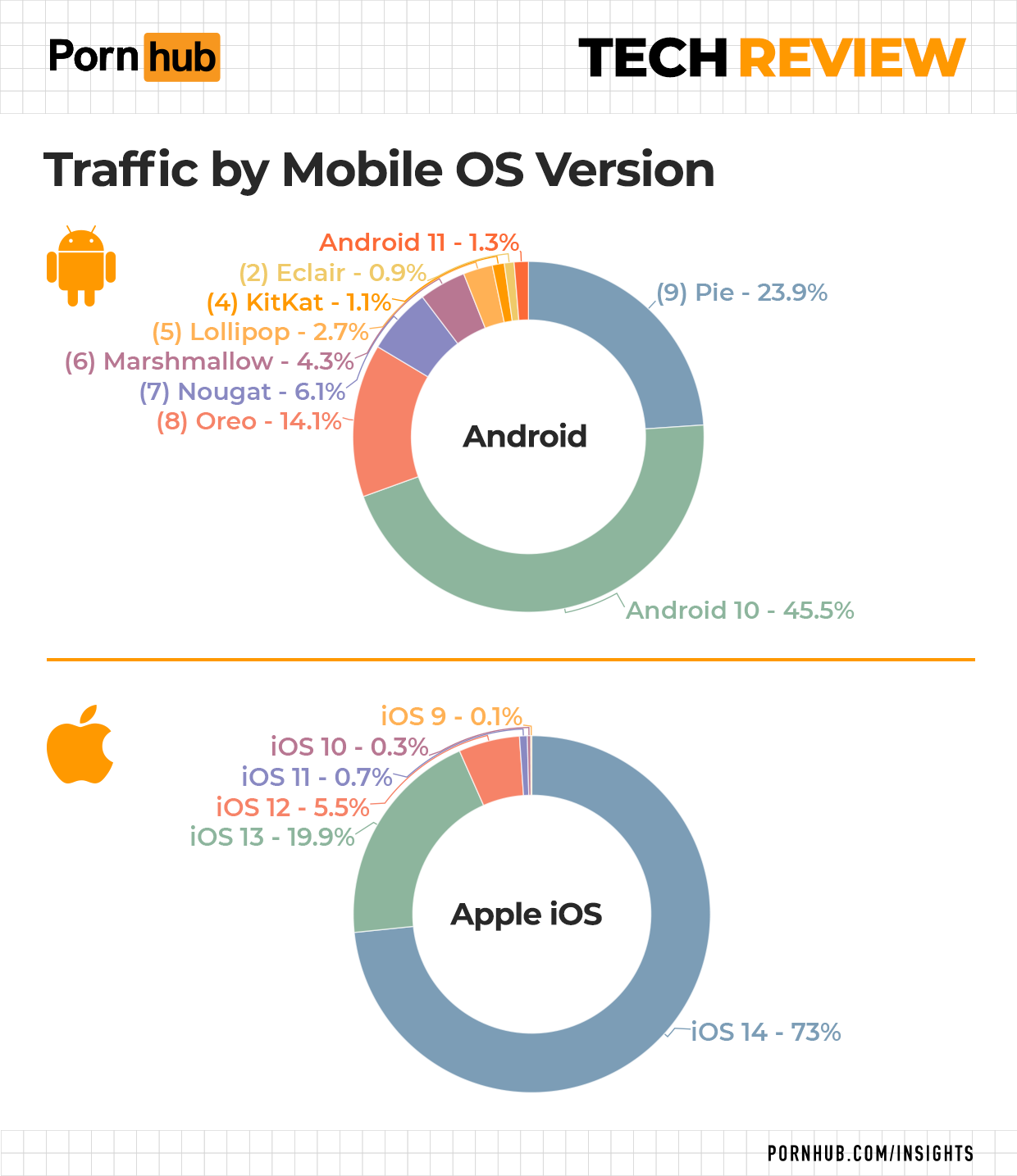 Compare that to Android devices, where only 1.3% are using the latest Android 11 which had also been released in September. 24% were still using “Pie” which was released in 2018, 14% on 2017’s “Oreo” and 6% on 2016’s “Nougat”. Nearly 5% of Android users still arrive at Pornhub using an Obama-era operating system.