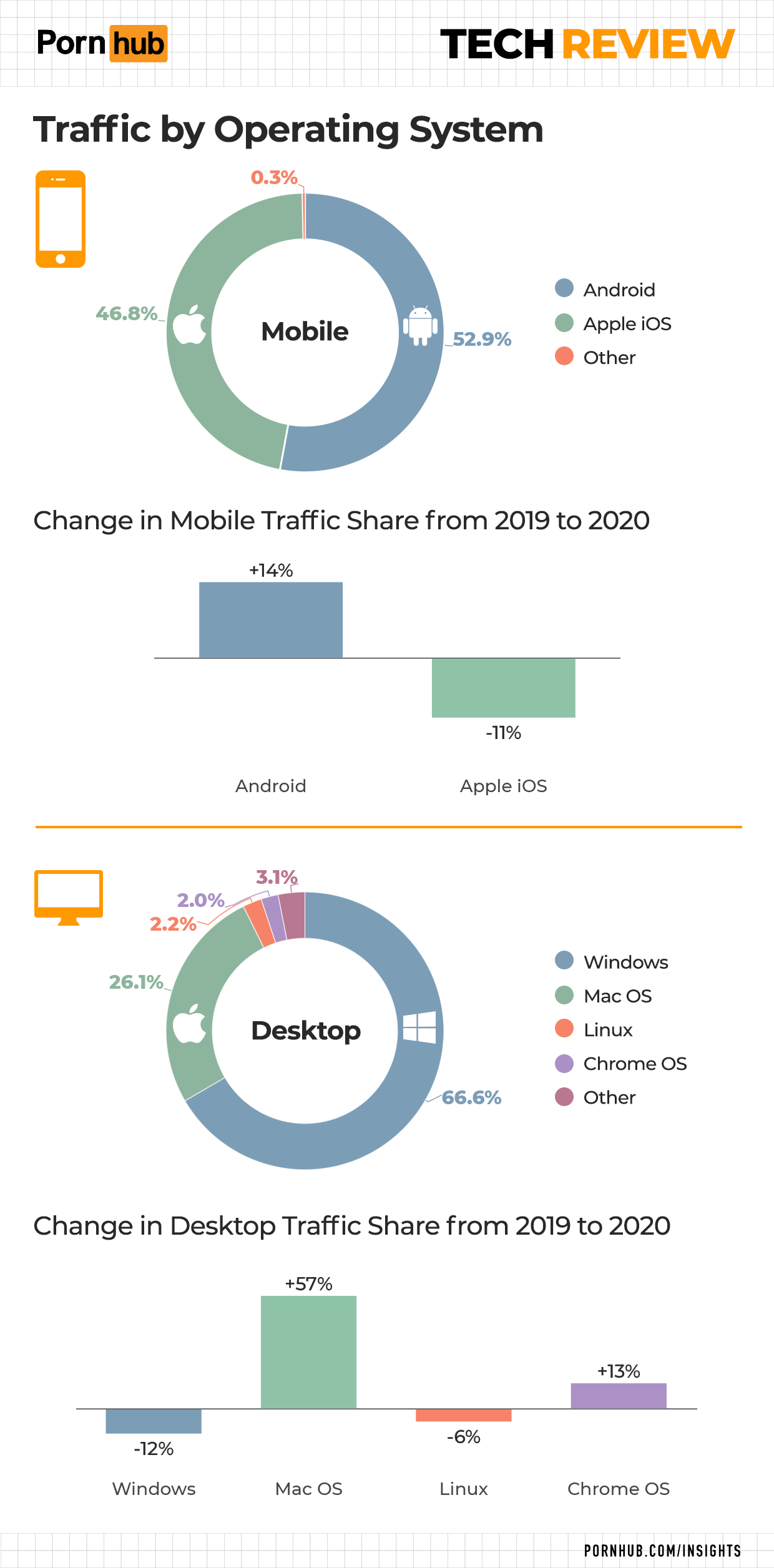While desktop operating systems make up only 15% of Pornhub’s traffic, it’s still an active tech group as the share of MacOS users grew by +57% in 2020. The extra Apple traffic came directly from a loss in systems running Microsoft Windows. In 2020 Windows made up 66% of desktops compared to 76% the previous year. Mac OS grew to 26% in 2020 compared to just 16% in 2019.