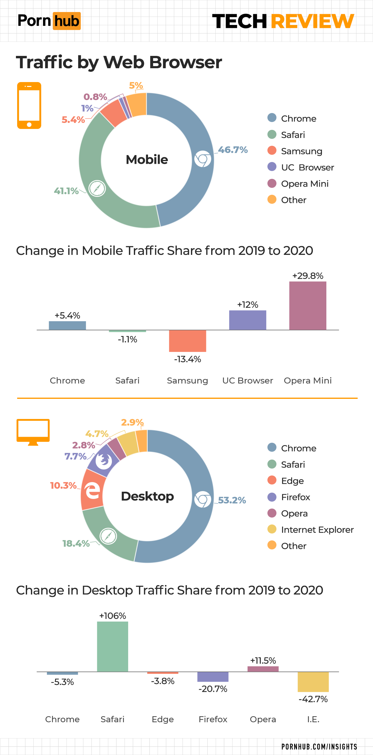 Over the past year, technology has played a more pronounced role in our daily lives, as both a source of entertainment, and how we communicate with friends, family and coworkers. Quite often it’s the same tech that we use to touch ourselves, that we use to keep in touch with others, so Forbes asked Pornhub’s statisticians to take a closer look at the tech we use to log on and get off.
