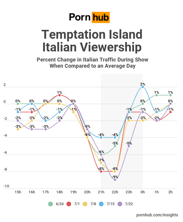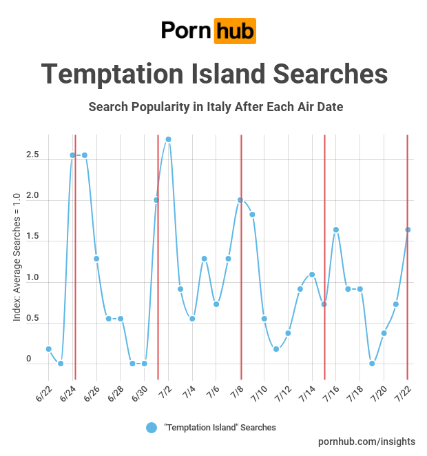 After the last episode of Temptation Island’s 2019 series we decided to look at Pornhub’s visitor traffic from Italy along with Rolling Stone Italia, to see if this summer’s record tv program was enough to take people’s attention away from Pornhub.