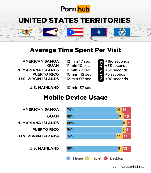Over the last several years the Pornhub Insights team has provided a myriad of data on the United States and its 50 states but we’ve never taken a close look at the U.S. territories. Well that day has finally arrived! Today our statisticians are serving up fresh data on the porn viewing preferences of Puerto Rico, the Northern Mariana and Virgin Islands, Guam and American Samoa.